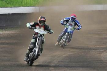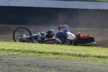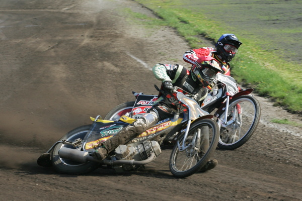 Nyní si pardubický závodník načasoval svůj zničující útok do druhé zatáčky. Zvnějšku si najel na vedoucího Adriana Rymela. Ale ten ho slyšel a za zlomem oblouku mu svůj motocykl navedl přímo do cesty. Aleš Dryml však stále číhal za jeho zády. A nemohl si nechat ujít poslední šanci v závěrečné zatáčce. Do cílové rovinky se vřítil zleva vedle svého soka, aby se metou prohnali takřka současně.