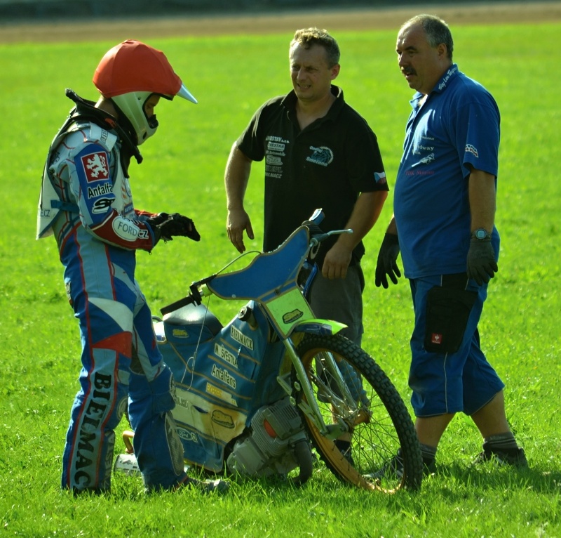 „Nejede mi to,“ posteskl si Jaroslav Petrák. „Je to trápení se. Už má motor odjetý a potřebuje naladit. Jinak jsem spokojenej‘, ale motor nemá sílu, vadne to a nejde dopředu. Myslel jsem, že jednu jízdu vyhraju. Matesovi jsem pak říkal, proč předjíždí veterána. Měl jsem radost, že bych po dlouhý době zase vyhrál jízdu.“
