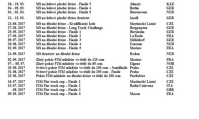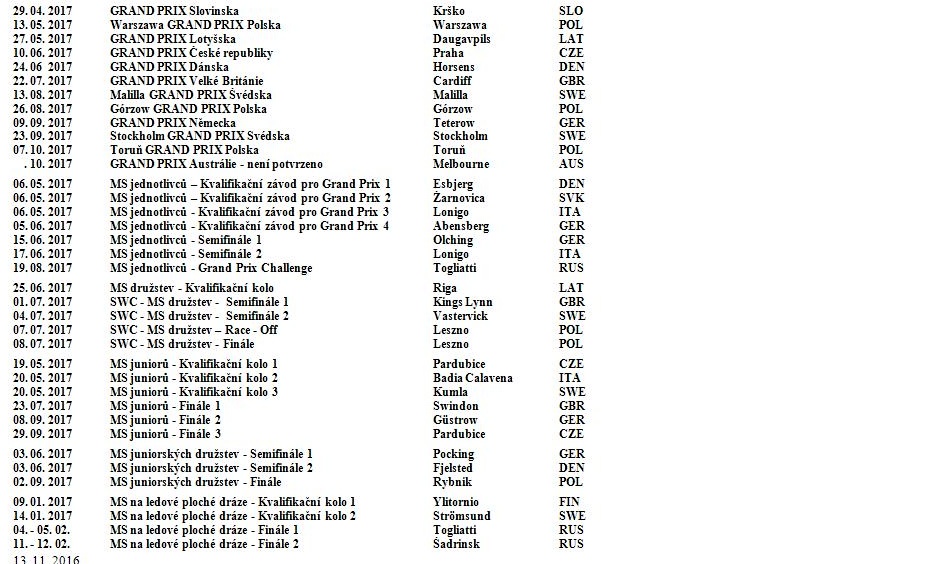 Světové šampionáty mají po víkendovém jednání FIM ve Varšavě jasný jízdní řád pro sezónu 2017. Dle kalendáře nepřijde zkrátka ani český divák. Vedle české velké ceny v Praze může vyrazit do Pardubic dvakrát na světové juniory, na dlouhodrážní kvalifikaci do Mariánských Lázní a v srpnu dokonce třikrát na dvěstěpadesátky do Prahy a Pardubic. Žarnovica je zase pořadatelem kvalifikačního kola pro SGP 2018.