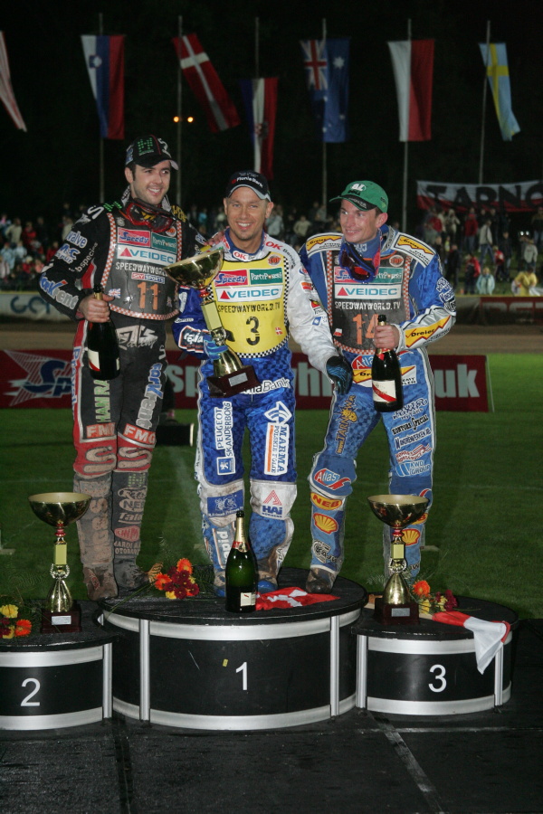 Nicki Pedersen před malou chvílí dobyl slovinské Krško. Už před semifinálovými rozjížďkami dnešní slovinské velké ceny nemohl být v celkové klasifikaci seriálu Grand Prix předstižen. A podruhé ve své kariéře se stal individuálním mistrem světa. Triumfální sérii dotáhl až do konce, protože se vyhrál celou velkou cenu. Na stupních vítězů mu společnost dělali Scott Nicholls a Rune Holta.