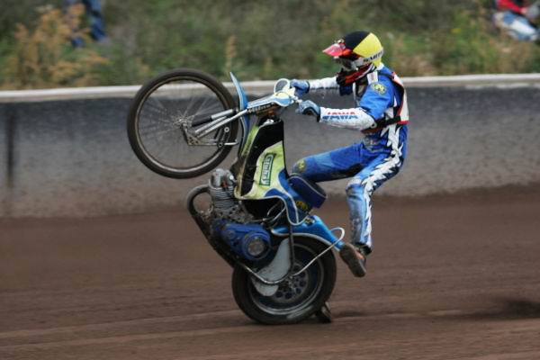 „Přesně tak,“ souhlasí a pouští se do líčení, jaké páky pohnuly horou, aby přišla k Mohamedovi a on opět naskočil do závodního kolotoče. „Po marném pokusu dostat se s dodávkou zpět do Anglie na konci roku 2006 jsem musel změnit plány na celý rok 2007. To znamenalo začít montovat regály ve frankofonních zemích. Jenže to vůbec nebylo pro mě. Až na peníze všechno špatně. Krok dozadu. A když k tomu připočtu, že jsem se vnitřně nesmířil se skončením s plochou dráhou, což mě pronásledovalo celý minulý rok a zimu, výsledkem se stalo psychický dno. Řekl jsem si dost s regálama! Užiju si super léto v Čechách a hodím konečně všechno za hlavu. Vtom přišel telefonát ze Živanic od Vláda Višvádera, a přijedu na kulečník a pivko. A to byla jedna ze sil, co pohla horou k rozhodnutí vrátit se zpět k závodům! Jinak by to skončilo asi jen občasným trénováním ve Svítkově. Posílám velké díky do Živanic Vladovi a jeho přítelkyni Daně. Z tohohle směru přišla psychická podpora, za což jsem vděčnej. Stalo se, co jsem si přál, užil jsem si skvělý speedway léto!“