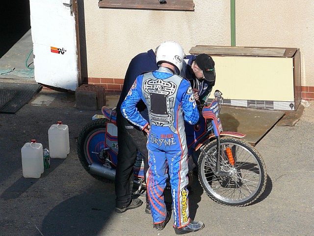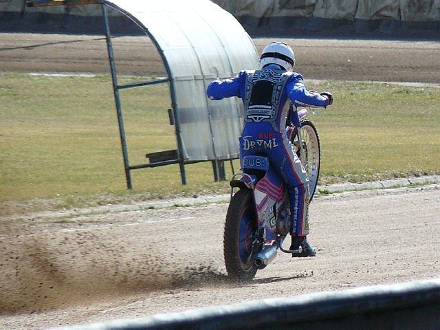 Svítkovský stadión se včera opět rozbouřil rykem plochodrážních motocyklů. Bratři Drymlové měli lehčí trénink před odjezdem do Anglie. Čtenář magazínu speedwayA-Z Jiří Havlíček jel náhodou kolem. Zmáčknul několikrát spouš svého fotoaparátu, a tak se můžete letos jako první podívat na snímky Lukáše Drymla v akci.
