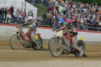 Hned tři velké favority k sobě svedla druhá rozjížďka. Proti trojici německých dlouhodrážních es Schützbachovi, Rissovi a Bacherovi se na start postavila naše reprezentační dvojice Wolff, Ondrašík. Vítěz loňské Grand Prix Německa ve Pfarrkirchenu Sirg Schützbach startoval po boku šestinásobného mistra světa Gerda Risse, z červené dráhy jim však oběma dokonale vypálil rybník vítěz loňské kvalifikace MS v Mariánských Lázních Daniel Bacher. Ten předvedl bleskový start a v první zatáčce si poradil nejen s dotírajícím Rissem, ale i s Pavlem Ondrašíkem, který předvedl od mantinelu výborný start. Na rovince se však Pavel musel bránit útoku Richarda Wolffa, který jej také v nájezdu do druhé zatáčky předjel. Husarský kousek předvedl Schützbach, který jezdil celá tři kola na posledním místě, aby v tom závěrečném postupně předjel Erika Eijbergena a k naší lítosti i Pavla Ondrašíka. Zvítězil tedy Bacher, který tak potvrdil roli černého koně závodu a nechal za sebou Gerda Risse i Richarda Wolffa.