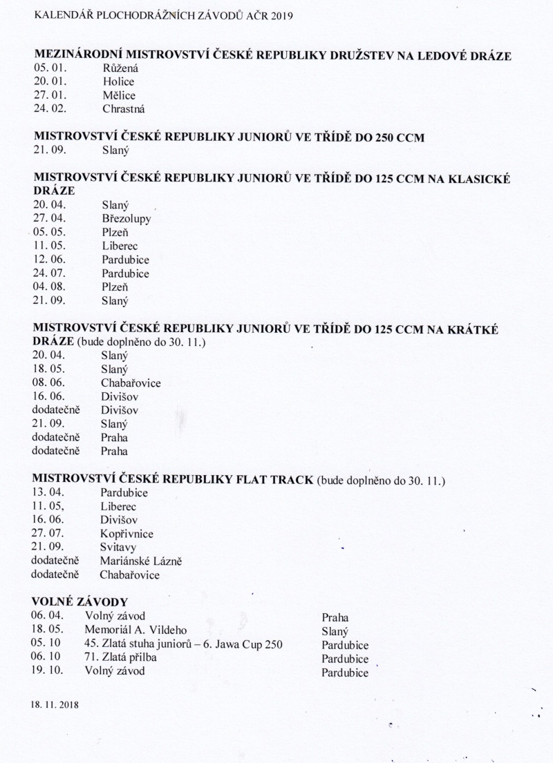 Jedním z bodů programu sobotní konference ploché dráhy v Pardubicích byla finalizace termínového kalendáře na příští rok. Byť je v něm pár bílých míst, brzy mají být zaplněna. Včera večer byla jeho podoba oficiálně uvolněna ke zveřejnění.