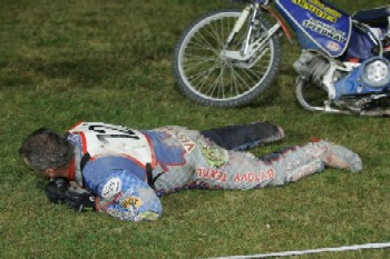 jsem byl u dalšího úspěchu. Ve svých letech se potřebuju víc rozpálit. Když se mi to povede, je to vidět. V klubu je krásná atmosféra, lidi to prožívaj‘ jako na fotbale. Dal jsem to toho všechno, pan Grepl dokázal ty lidi stmelit. Na konci kariéry jsem poznal správnej‘ tým. V Praze jsem se nakonec modlil, aby našim střelcům třeba neprask‘ řetěz nebo něco. Byly to tutovky, ale přesto, je to sport, je to motorismus. Třeba i Schumacherovi došel benzín… Bylo to zmatený a přišlo mi, že soupeři měli svázaný ruce. A to my měli poruchy! Já, měl ji Filip i Honza Jaroš. Ale bylo to asi tak, jak to mělo být. Vůbec jsem si neuvědomil, že bych moh‘ přestat běžet, aby Slaný nedal žolíka. Vedení mělo dost času mě na rovince zastavit. Neběhám jako superman a nepočítám skóre. Dvě extraligy jsem jel vlastně navíc. Jedna byla ve Mšeně zrušená a v Praze jsem byl místo zraněnýho Topinky. Loni jsem si užil extraligu jako už dlouho ne. Zajel jsem si šest závodů. Mám už titul se Slaným, ale to jsem jel jen dvě jízdy. Je to můj druhej‘ titul, ale tento byl hezkej‘, byl jsem v týmu a jel víc než jeden závod.“