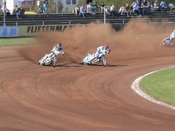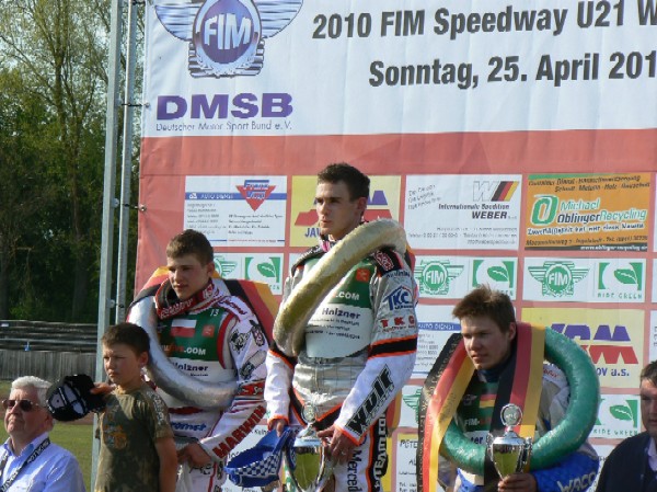Suverénem závodu naopak byl i u nás ve slánských barvách startující Slovák Martin Vaculík. Ten v celém závodě neztratil jediný bod, potvrdil, že se po vyléčení komplikované zlomeniny stehenní kosti dokázal rychle vrátit do vrcholné formy a bude zajisté patřit mezi horké kandidáty celého juniorského šampionátu. Rozhodující tři body pro konečné pořadí v závodě vybojoval ve dvanácté jízdě, kdy si po útoku venkem vychutnal největšího rivala Poláka Przemyslawa Pawlického. Loňský mistr Evropy v kategorii do devatenácti let neměl proti Martinově pečlivě připravovanému ataku nárok. Další body ale téměř ještě dětsky vyhlížející Polák neztratil, takže sekundoval vítězi závodu po jeho pravici v závěrečném defilé na stupních pro nejlepší. Spolu s nimi se tam vešel ještě dvanáctibodový Frank Facher. Téměř místní borec tak beze zbytku naplnil postupové ambice vkládané do něho mnoha domácími příznivci před začátkem závodu.