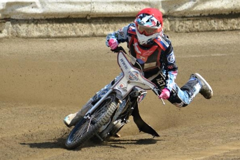 Dějiny ploché dráhy jsou svým způsobem také dějinami jezdeckých stylů. A někdy i svědky slepé uličky vývoje. Jakub Valkovič chtěl získat na rychlosti, že se bude odrážet nohou jako na koloběžce. Ale ouha… Nicméně Mirek Horáček stačil pořídit efektní snímeček.