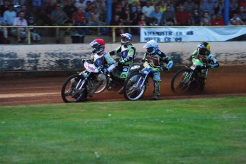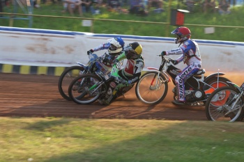 Nové nafukovací mantinely se dočkaly svého křtu už v rozjížďce s číslem jedna. Dopředu letěli Tomáš Suchánek s Hynkem Štichauerem, ovšem domácí byli za nimi. V první zatáčce spadl Tomáš Topinka a hned po něm i Hynek Štichauer a Jan Jaroš. „Zavřeli jsme Topase mezi sebe,“ líčil Hynek Štichauer. „Neměl kudy jet.“