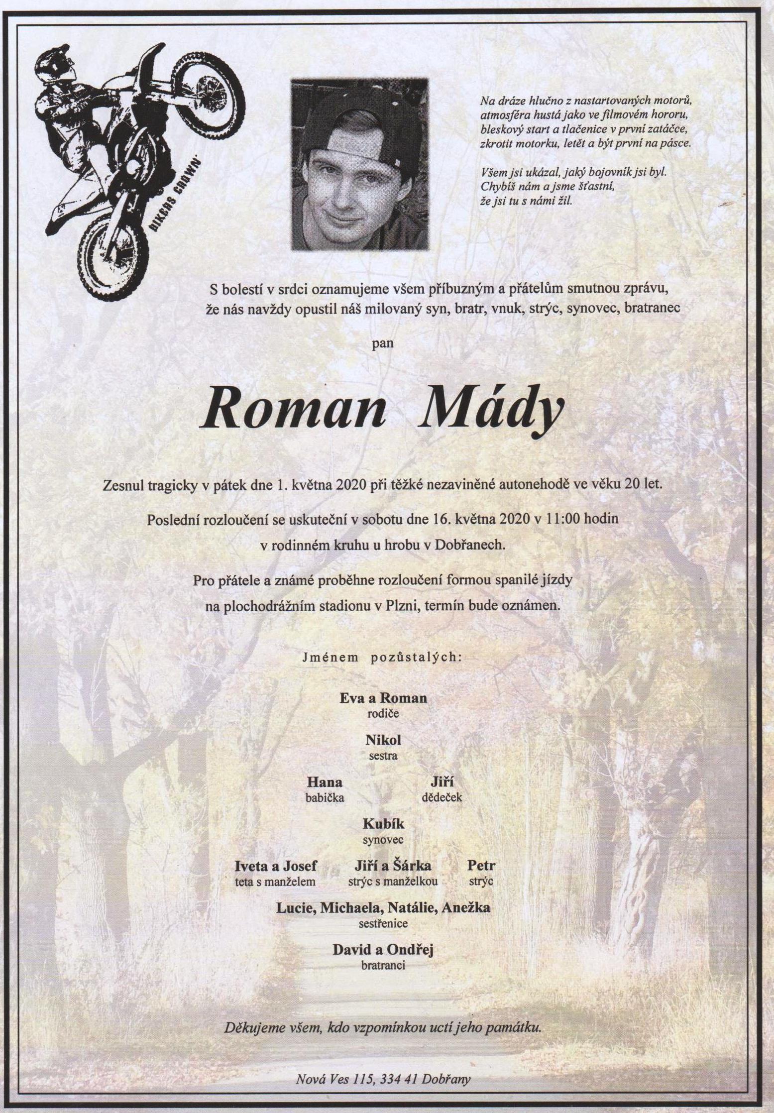 společenská rubrika Za Romanem Mádym 12.5.2020 Antonín Škach Poslední rozloučení s Romanem Mádym se bude konat tuto sobotu v rodinném kruhu u hrobu v Dobřanech. Přátelé se s drahým zesnulým rozloučí spanilou jízdou na borském plochodrážním stadiónu, jejíž termín bude ještě oznámen.