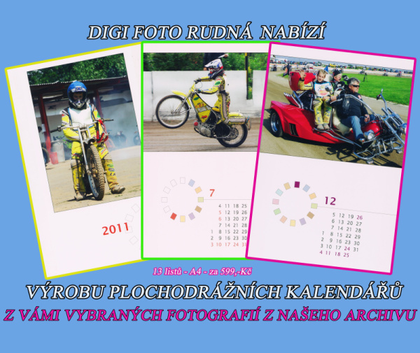 Pavel Fišer, vedoucí fotograf magazínu speedwayA-Z, je jedním z mála, který pracuje na plochodrážních podnicích všech úrovní. Za sezónu pořídí tisíce fotografií Markéta Cupem počínaje a Grand Prix konče. Portfolio jeho prací zahrnuje akční snímky stejně jako portréty, stupně vítězů či akční záběry. Nyní společně se svou manželkou Renatou nabízí novou službu. Ze svých snímků vám vyrobí nástěnný kalendář. Třináct listů ve formátu A4 můžete pořídit už od Kč 599, přičemž od pěti kusů už začínají množstevní slevy. Prvním majitelem vlastního kalendáře se stal král českých stopětadvacítek Michal Škurla.