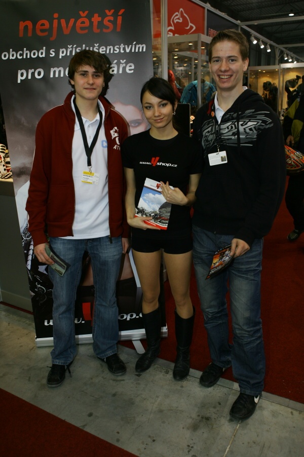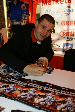Zde jsem se v první chvíli setkal s Petrem Ondrašíkem, šéfem Markéty v Praze, a hned po té i s Matějem Kůsem, který těsně po podpisu plakátů pro účastníky výstavy odešel na oběd. Na cestě k plochodrážnímu stánku šlo potkat Ondřeje Veverku s Pavlem Pučkem, kteří nabízeli letáčky na květnovou Grand Prix všem průchozím návštěvníkům výstavy.