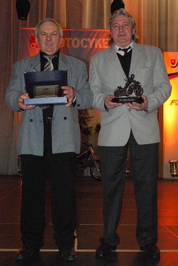 Na Večer majstrov dostal totiž pozvanie Ján Daniel, ktorý sa v minulom roku dožil 60-tich narodenín a SMF si ho chcela ucti vyznamenaním za prínos pre plochodrážny šport na Slovensku. Večer samozrejme patril hlavne vyhlasovaniu majstrov Slovenska všetkých disciplín motocyklového športu. Tento rok chýbalo vyhlásenie a ocenenie majstra SR na plochej dráhe, nako¾ko sa v minulej sezóne kvôli dažďu nepodarilo rozohra ruletu o najlepšieho plošinára ani na dva pokusy. Aj napriek tomu však okolo 400 prítomných hostí tlieskalo aj zástupcom plochej dráhy. Prvý sa na pódium dostal Ján Daniel, ktorý bol z rúk prezidenta SMF Petra Smižíka obdarovaný plaketou. „Som prekvapený a zároveň ve¾mi šastný, že si na mňa v SMF spomenuli,“ v krátkosti opísal dojmy z večera Ján Daniel. Hneď po ňom nasledoval dlhoročný žarnovický štartmaršál Július Vallo, ktorý za prínos pre plochú dráhu dostal miniatúru plochodrážnika v akcii.