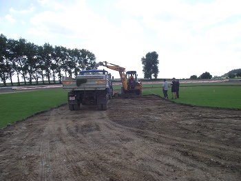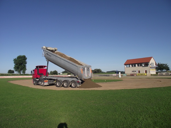 V sobotu a neděli byla závodní tra vyměřena, aby hned v pondělí 27. června za ranního kuropění byla dráha pomocí bagrů a nákladních aut zbavena drnů a pomalu ale jistě dostávala tvar závodního oválu. V úterý byl ovál dočištěn a zarovnán. Zároveň byl položen pod úroveň povrchu v prostoru startu elektrický kabel ke startovacímu zařízení. Současně se podařilo provést i další drobné zemí práce na stadionu.