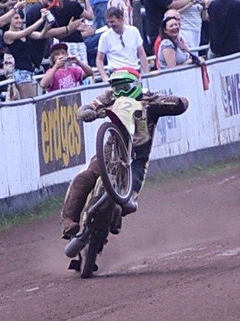 Naši se sice udrželi na stříbrné pozici za Němci, ale Francouzi s Holanďany se dotáhli na dostřel jediného bodu. Pramálo důvodů k radosti, když nás čekala jízda proti výběru Německa. Aby toho nebylo málo, Dryml nedokázal uvést do chodu svůj motocykl, proto jej musel v jízdě zastoupit Pavel Ondrašík. Vypadalo to na pořádný výprask, ale to by nesměl být na startu Pepíček Franc. Jako jediný dokázal svést s Němci vyrovnanou partii, po startu se pověsil za Stephana Katta a Smolinskému s Tebbem nezbylo po celá čtyři kola nic jiného než polykat písek od zadního kola pražského závodníka. Statečná prohra je však i přesto prohra a skóre 10:5 pro Němce nás sesadilo z druhé až na čtvrtou pozici. Holanďané si poradili s Finy a Britové využili defekt Mathieu Tressarieu k výhře nad francouzským výběrem. Pro nás to znamenalo jediné, stříbrný sen se rozplynul, zbývá bojovat o bronz. Do finále A jdou s Němci Holanďané, nás čekají v béčku Britové.