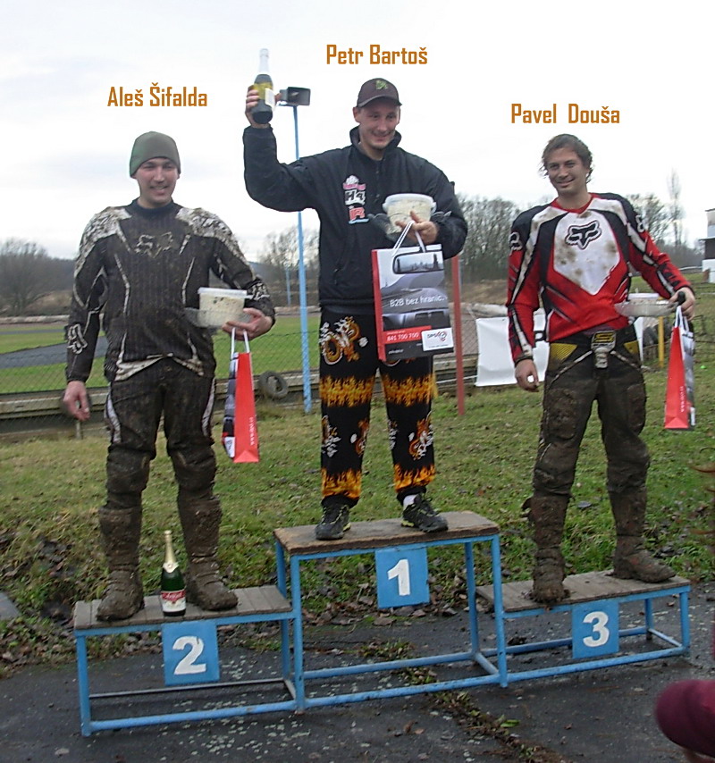 Se zkřivenými řidítky, ale pokračoval v jízdě a nakonec si po čtyřiceti minutách dojel i pro sladké vítězství. Na druhém a třetím místě dojeli bývalí plochodrážní závodníci SC Chabařovice – Aleš Šifalda a Pavel Douša.