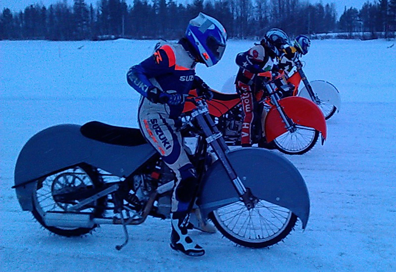 Čeští ledaři se však na daleký sever vypravili kvůli ježdění. „Ráno na desátou, kdy svítá, jsme dorazili na patnáct kilometrů vzdálené jezero, kde pro nás byly připraveny tři dráhy,“ líčí přeloučský ledař patálie polární noci. „Hned jsme vyrazili na led. Při prvním svezení si ustlal Honza Pecina, kterýmu ušlo zadní kolo. Další exhibice čekala na mě, když jsem trošku přepálil nájezd. Na staré gumě, kterou jsem měl jako rezervu, když jsem u nový utrh‘ ventilek, mě kopla díra. Letěl jsem po zádech až do sněhu. Na první den toho bylo dost!“