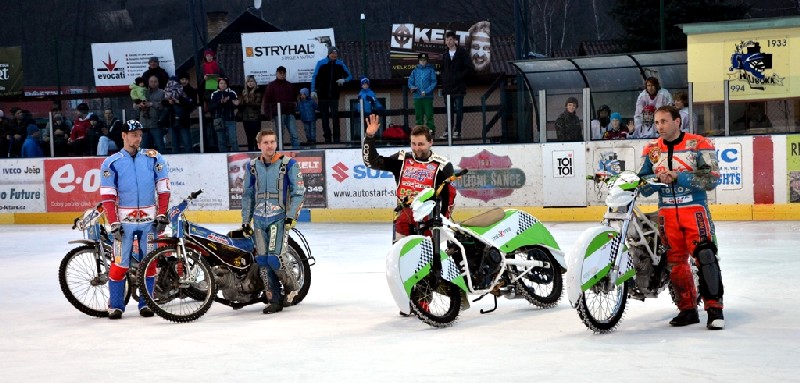 „Chtěli jsme oslavit MDŽ a poctít nástup novýho prezidenta rozbitím ledu,“ svěřuje se Jan Holub prostřední, co ho podnítilo k pořádání akce. S motocykly se šroubky v kolech se představili jeho syn Jan, Zdeněk Simota a František Irmiš, jenž získal nepsaný titul krále pádů. Klasické speciály na ledovou dráhu osedlali bratři Andrej a Josef Divišovi.