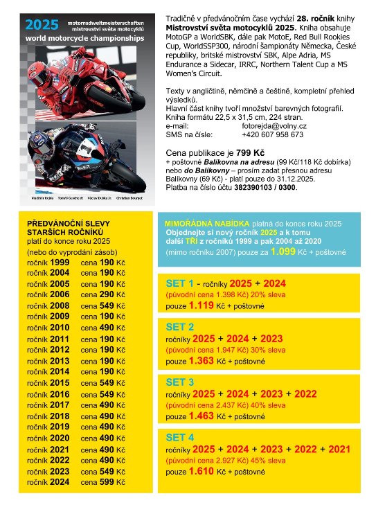 Tradičně před Vánoci vydává Vladimír Rejda s týmem svých spolupracovníků výpravnou knihu Mistrovství světa motocyklů. Tradičně se slovem, výsledky a především obrazem ohlíží za uplynulou sezónou na motocyklových okruzích. Letos přichází i novinka, a sice kalendář.