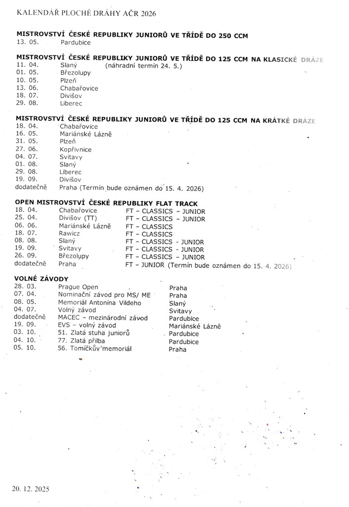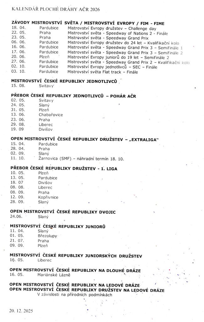 O termínovém kalendáři české ploché dráhy se jednalo v Praze již předminulý týden. Od té doby ladila sportovní komise jeho definitivní podobu až do dnešního dopoledne. Úderem dvanácté byl oficiálně zveřejněn. Plus jako bonus, že v pátek před Zlatou přilbou města Pardubice se ve Svítkově pojede rozhodující finále SEC. Jeho ostatní podniky slibuje promotér dodat těsně před koncem roku.