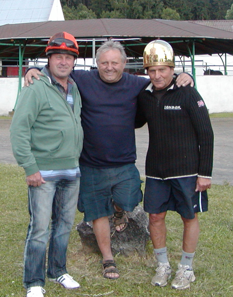 Než jsme odjeli, dostal jsem nápad, že si obě legendy vymění pokrývku hlavy, což v případě Jirky Štancla je zlatá přilba a v případě Josefa Váni pravá závodnická přilba na dostihy. Jak to dopadlo, je vidět na přiložené fotografii. Myslím, že to oběma sekne.