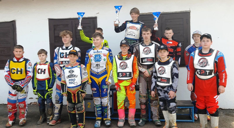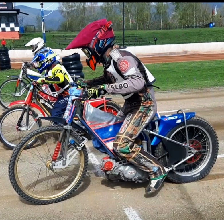 Pak už všichni jeli perfektně. Pouze jsme viděli dvě vyjetí z dráhy Jakuba Fingera a Vojtěcha Stachníka z Kopřivnice. Vojtovo vyjetí bylo trochu smolné, protože to bylo z prvního místa a stálo ho tři body. Kopřivnice překvapila nejen počtem svých svěřenců, ale i neexistencí povlaků na přilby a tudíž nutností improvizace různých hadříků. Úsměvná situace, ale obdiv, jak si s tím Kopřivnice poradila.