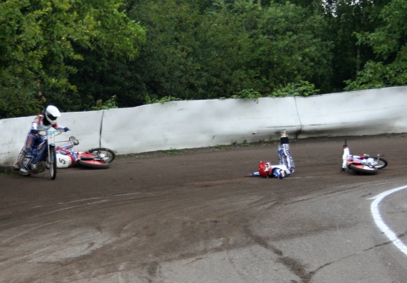 Všem třem totiž nešlo o nic menšího než o postup do finále A, který při těsných bodových odstupech mohlo garantovat jedině vítězství. Odstartovali jako jeden muž a hnali se vstříc první zatáčce. V jejím výjezdu však oba Chabařovičané upadli a Petr Chlupáč vyvázl z hrozící kolize jen s nasazením všech sil.