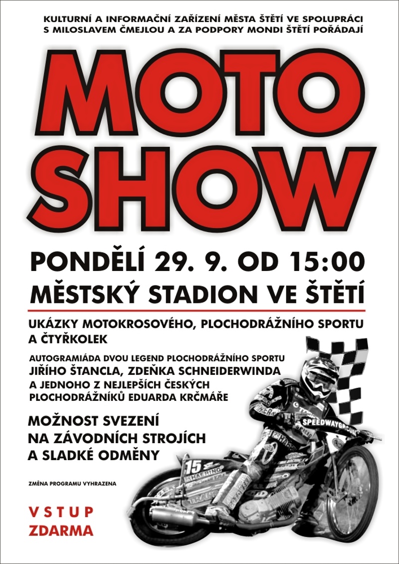 Moderátor Miloslav Čmejla ve spolupráci s kulturním střediskem ve Štětí připravil již čtvrtý ročník MOTO SHOW, která je určena pro děti i dospělé. Konat se bude v pondělí 29. září v areálu fotbalového stadionu ve Štětí od patnácti hodin. Na programu budou ukázky motokrosu, čtyřkolky a plochá dráha. Proběhne autogramiáda českých legendárních závodníků, mistra Evropy, Zdeňka Schneiderwinda, vítěze pěti zlatých přileb Jiřího Štancla a jednoho z nejlepších současných plochodrážníků Eduarda Krčmáře ze Slaného. Přijede i plochodrážní školička manželů Šifaldových z Chabařovic. Děti nemine mimo tradičních sladkostí ani nejžádanější atrakce, kterou je svezení na závodních strojích. Ke koupi bude i nově vydaná kniha Miloslava Čmejly Od řidítek k mikrofonu, kterou autor na místě případným zájemcům, velmi rád podepíše. Vstupné zdarma.