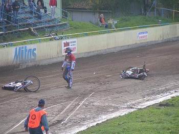 Těsně za ním jedoucí Lázsló Szatmári už neměl šanci se vyhnout. Oba závodníci skončili v hrozivých saltech na dráze. Český borec vyskočil na nohy, ovšem pro Maďara přijela sanitka z uherskohradišské nemocnice.
