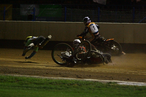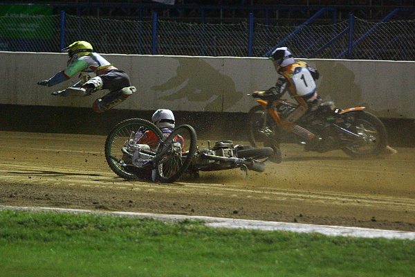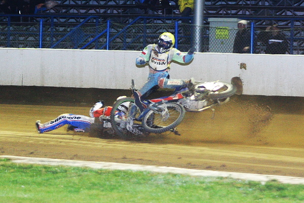 Jenže takřka současně upadl Rune Holta, který na svítkovské závodiště dorazil těsně před slavnostním zahájením. Nyní zůstal ležet v prvním oblouku a byl bez milosti vyloučen. Po restartu zůstal Lukáš Dryml vzadu. Leč v první zatáčce se spodní stopou rázem posunul z páté příčky na třetí. O kolo později nechal na stejném místě za sebou i Adriana Miedzinskeho.