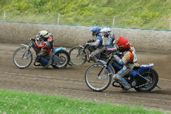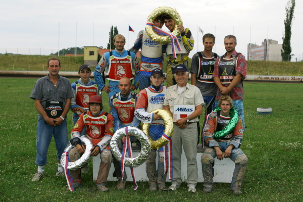 Březolupy se nenechaly zahanbit ani dnes odpoledne, kdy šampionát tříčlenných družstev pokračoval svým pátým kolem. V průběžné tabulce mají už neuvěřitelný osmibodový náskok. V praxi to znamená, že by mohly příští kolo na domácí dráze vynechat a stále by zůstaly na čele. Místo Liberce, který evidentně po ztrátě části sponzorů šetří na pořádání mistrovství republiky dvojic, představovaly pro moravský celek hrozbu Pardubice. Jenže Východočechy pronásledovala smůla. Tomáš Suchánek dvakrát sprintoval pro jeden bod tří čtvrtě kola, když mu jednou prasknul primární řetěz a podruhé explodoval motor. Zadřený motor si ze Slaného odvezl také Václav Milík. Se štěstím se na nejnižší stupínek postavili Liberečáci. Jan Holub byl sice v dodatkové jízdě za Michalem Dudkem, ovšem slánského závodníka nechal v posledním kole na holičkách motor. Doprovodné klání stopětadvacítek se stalo opět kořistí Jaroslava Hladkého, který i tentokrát ujel Danielu Hádkovi nejen ve vzájemné jízdě, ale i o další tři body v průběžné klasifikaci.