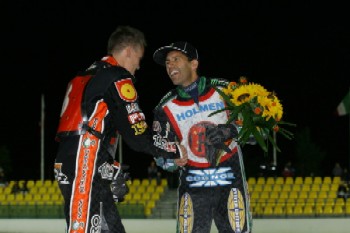 Greg Hancock byl však spolehlivou zárukou vítězství. Další zaznamenal v rozjížďce s číslem šest. Josef Franc za jeho zády ovšem dokázal ohlídat Jana Jaroše, který zaskočil za Filipa Šiteru. Zatímco potlučený Davey Watt seděl ve svém boxu jako hromádka neštěstí, na ovále ho zastoupil Adrian Rymel.