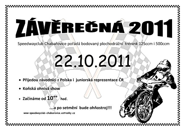 Svou Závěrečnou 2011 se Chabařovice rozloučily s letošní sezónou, která na levý břeh Labe přinesla opět pravidelné závodění. Mítinky se statutem bodovaných tréninků opanovali čeští závodníci. Nejprve ve stopětadvacítkách nepoznal přemožitele Jakub Ondroušek. Závod pětistovek, který ve své startovní listině zahrnoval i nečekaná jména, vyhrál Roman Čejka.