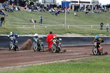 V dnešním úvodním extraligovém závodě vedl dlouho pražský Olymp. Plzeň a později i Slaný, jenž záhy vylepšil svůj katastrofální úvod, byly sice v těsném závěsu, avšak závodníci pořádajícího klubu si vždy dokázali udržet vrch. V sedmnácté jízdě pojistil jejich ambice svým vítězstvím Luboš Tomíček. Jenže pak na Olymp dolehly zlé časy. Kombinace jejich dvou bodů z třech závěrečných rozjížděk versus sedm slánských nakonec katapultovala na nejvyšší stupeň vítězů Slaný. Plzeň zaostala za vítězným celkem o pouhé dva body. O historický triumf jí připravil zadřený motor Zdeňka Simoty a nedorozumění s nasazením taktické rezervy. Pardubáci neměli svůj den. A jejich smůlu podtrhl úvodní pád Lukáše Drymla. Ten podle prvních zpráv skončil otřesem mozku a naraženým hrudníkem.