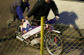 Ten už svlékl svůj slušivý červený kulich a nasadil si svou bílou přilbu. Ale, ejhle, nakonec musel sprintovat na dráhu Patrik Linhart. „Ohřejváme motorku, běžela normálně, ale nakonec odešlo zapalování,“ vysvětlil příčinu návratu k původnímu obsazení páté jízdy Vladimír Šíma, obrovitý mechanik Miroslava Fencla.