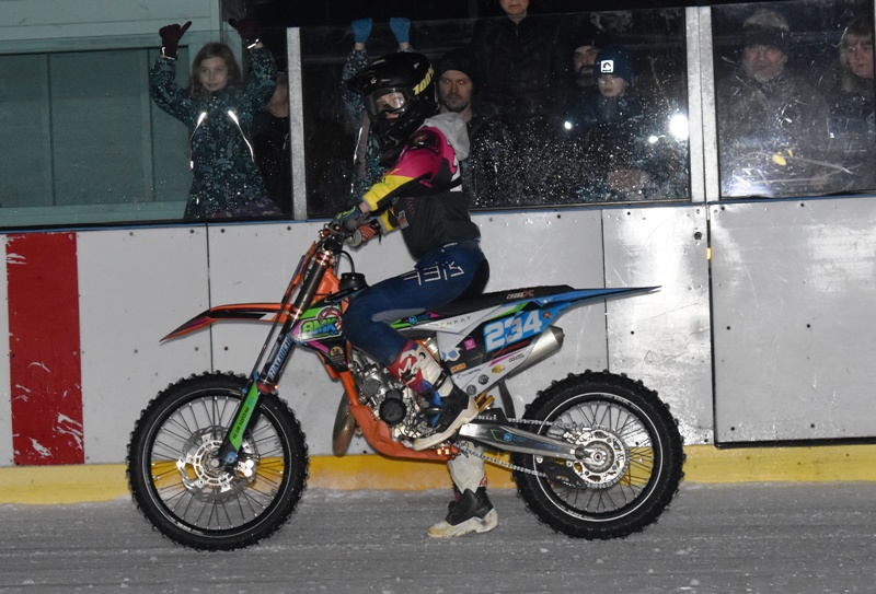 Hřiště jako první patři motokrosařkám. Tatínek Lindy Schlikxbierové je švagrem Antonína Klatovského mladšího. Do Hluboké si přiveze svou kamarádku z terénních tratí Vendulu Zátopkovou. Potlesk publika jako první patří oběma dlouhovlasým dračicím, které dokazují, že šroubky mohou být i na motokrosových strojích. Ostatně obě dívky v týdnu trénovaly na ledě v Milevsku.